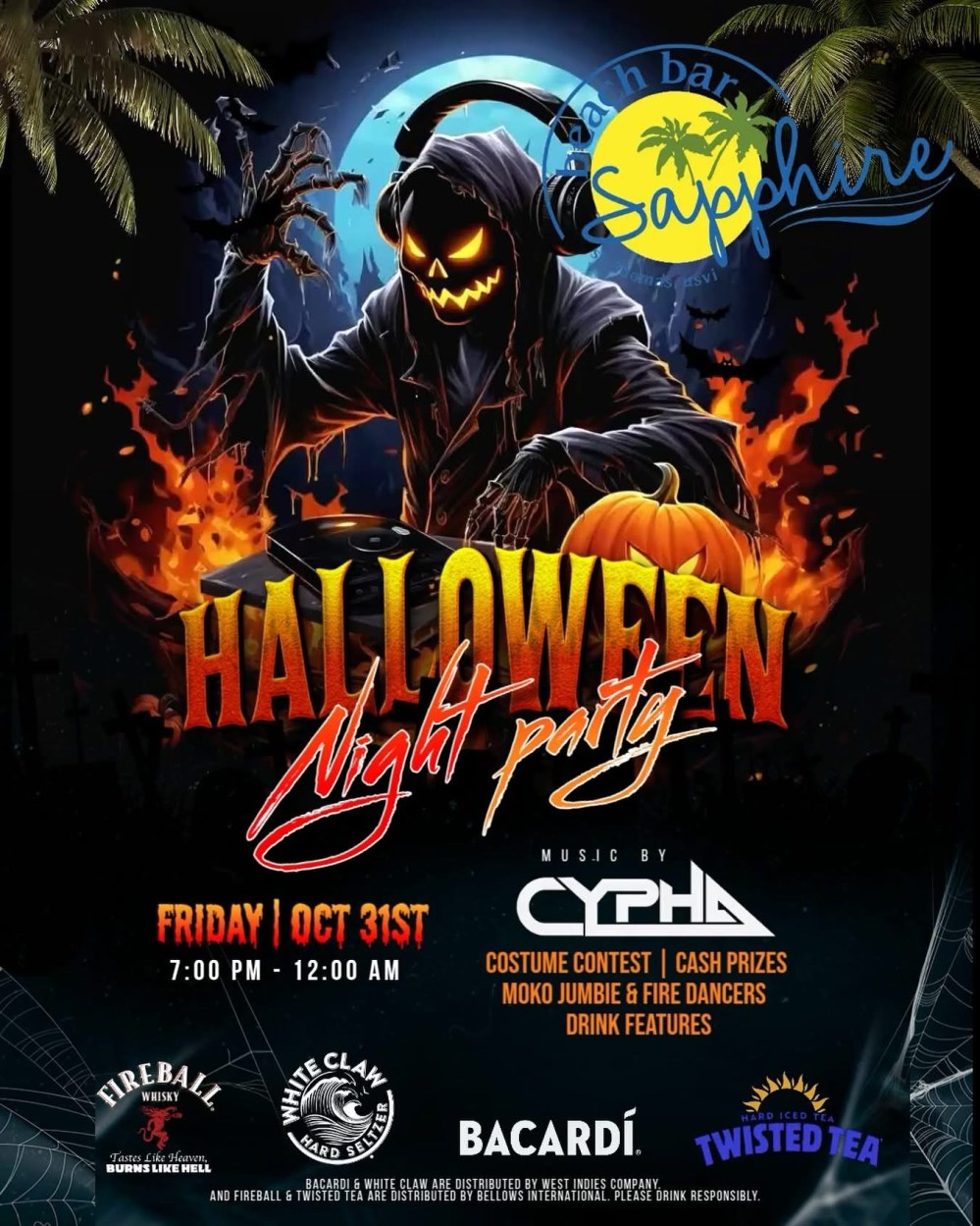 Halloween Night Party at Sapphire Beach Bar: This lively affair is adults only and runs from 7 to midnight on the 31st. Enjoy a live DJ, costume party, contests and specialty drinks.